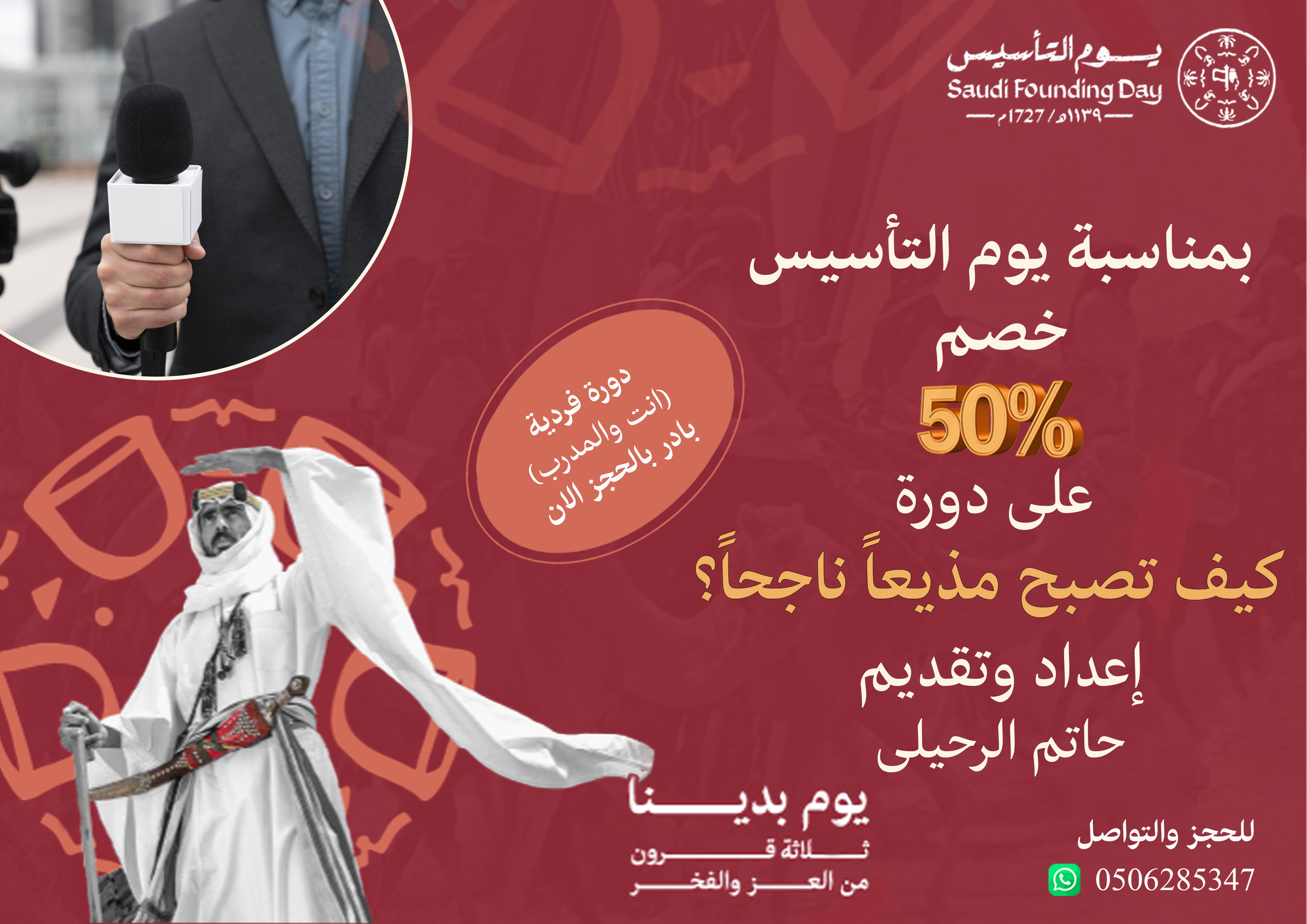 بمناسبة يوم التاسيس احصل على خصم 50% على دورة كيف تصبح مذيعا ناجحا؟ دورة فردية (انت والمدرب فقط) احجز الان 0506285347